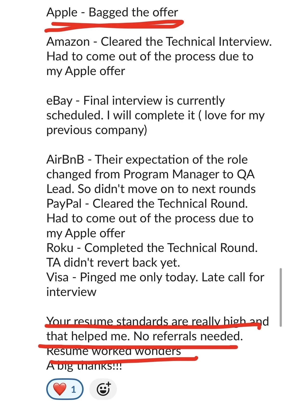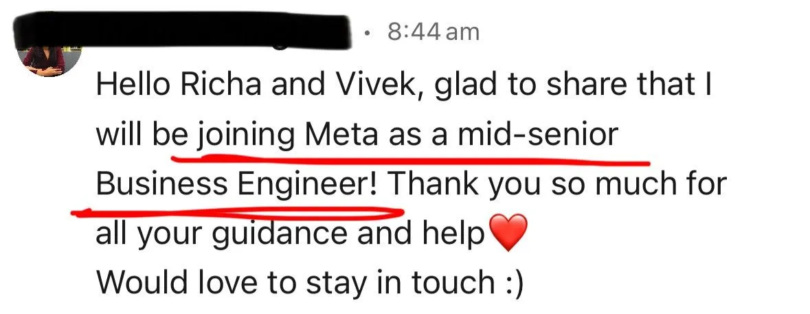 "If you want to be fearless in your career, grow, become confident and get what you deserve for your abilities, you need to work with Richa. Within days of updating my Resume, I got interviews from Google, Amazon, Coinbase, Meta and countless other companies. This program taught me how to interview confidently, highlight my achievements and land the next level role I deserved."